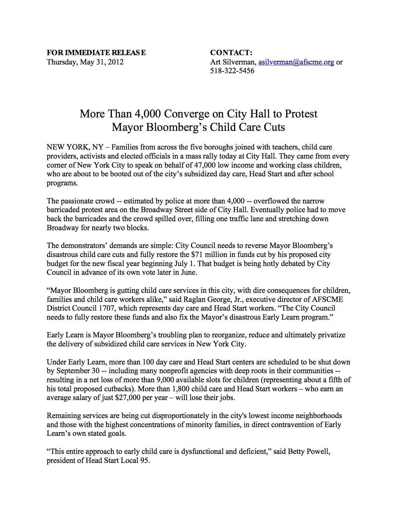 Results: AFSCME won the fight in NYC. Child care for 47,000 kids -- along with their teachers' jobs -- was restored to the city budget. In Albany, we fought the Governor to a bitter draw. Pension privatization and half of the proposed pension cuts were defeated.